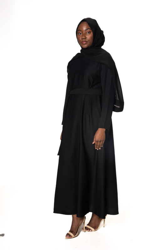 Jolie Nisa Basic Satin Abaya Black – Premium Modest Dress with Pockets, Belt & Hijab | Montreal, Canada