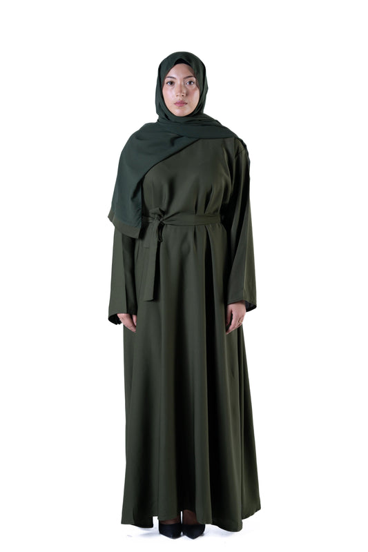 Jolie Nisa Olive Green Satin Abaya – Full-Length Modest Dress with Belt & Hijab